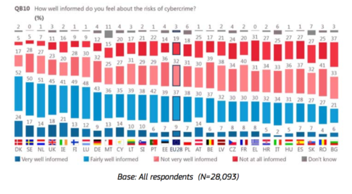 Mimoriadny Eurobarometer 464a skúmal názory a vnímanie viac ako 28000 občanov EÚ v kontexte kybernetickej bezpečnosti. Celkovo, 51 percent respondentov sa cítilo „vôbec nie” alebo „nie dobre” informovaných o kybernetických rizikách. Navyše, všetky krajiny z nášho užšieho zoznamu dopadli ešte horšie ako je priemer EÚ, pričom Slovensko, Rumunsko a Bulharsko skončili ako najhoršie.